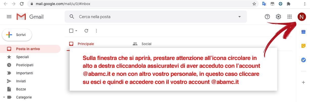 ATTENZIONE, CONTROLLATE SEMPRE DI ACCEDERE CON L'ACCOUNT @abamc.it E NON CON UN GMAIL PERSONALE. (vedi figura sotto).